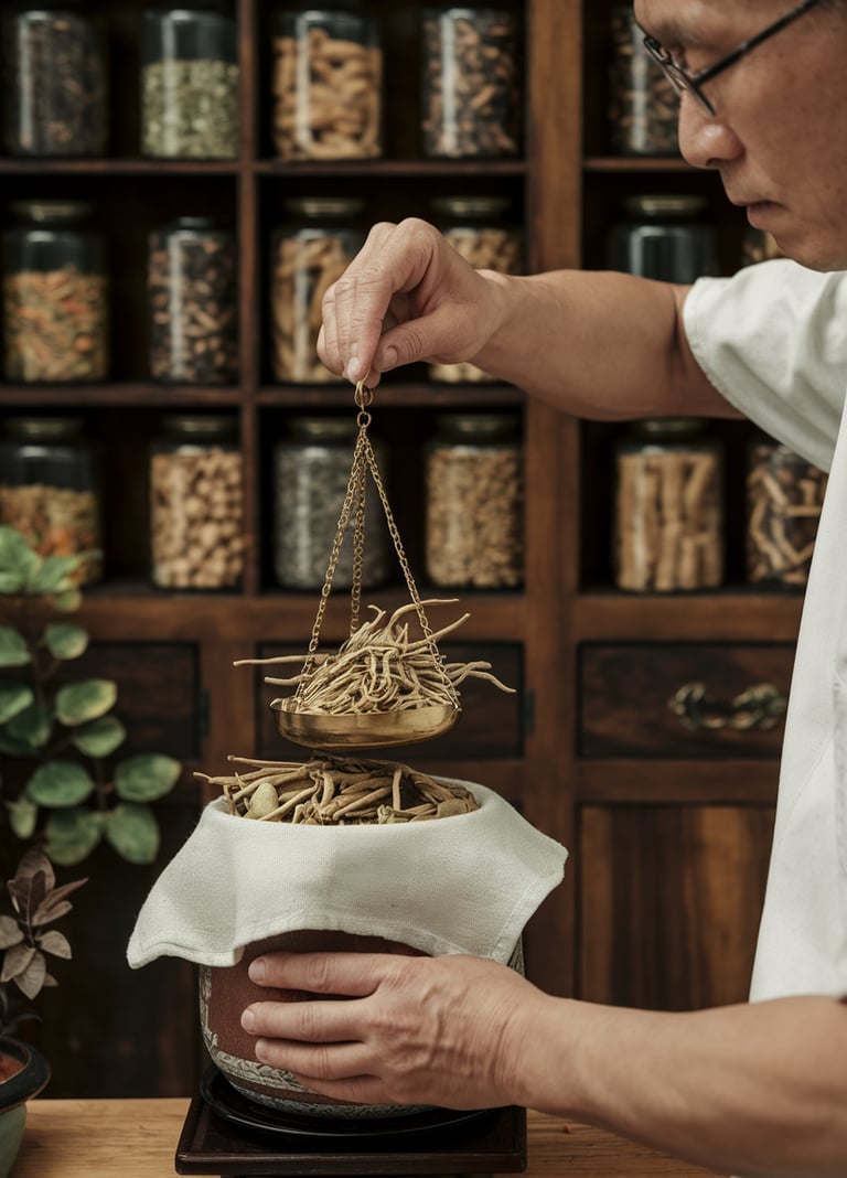 En la farmacopea china, las recetas se estructuran con roles definidos: hierbas principales (jun) para tratar el problema principal, hierbas secundarias (chen)